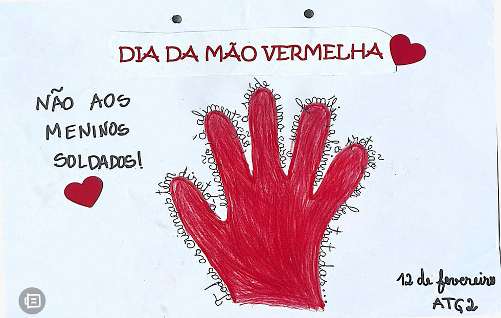"A Turma ATG2 comemorou o Dia da Mão Vermelha, Dia Internacional Contra o Uso de Crianças Soldados e relembrou os Direitos das Crianças.